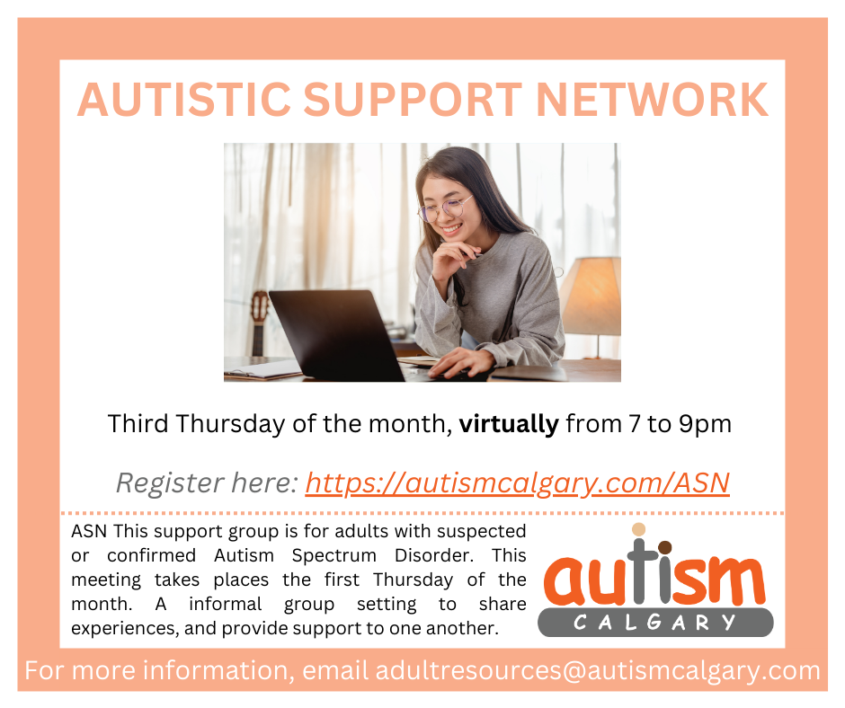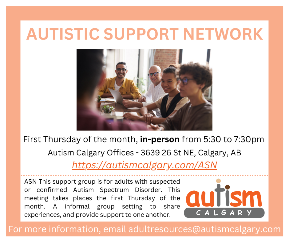 ASN meets in-person on the first Thursday of the month, from 5:30-7:30pm, at the Autism Calgary Office (3639 26 St, NE, Suite A, Calgary AB). And virtually on the on the 3rd Thursday of every month, running from 7-9pm.