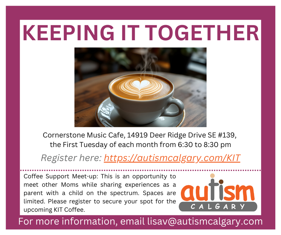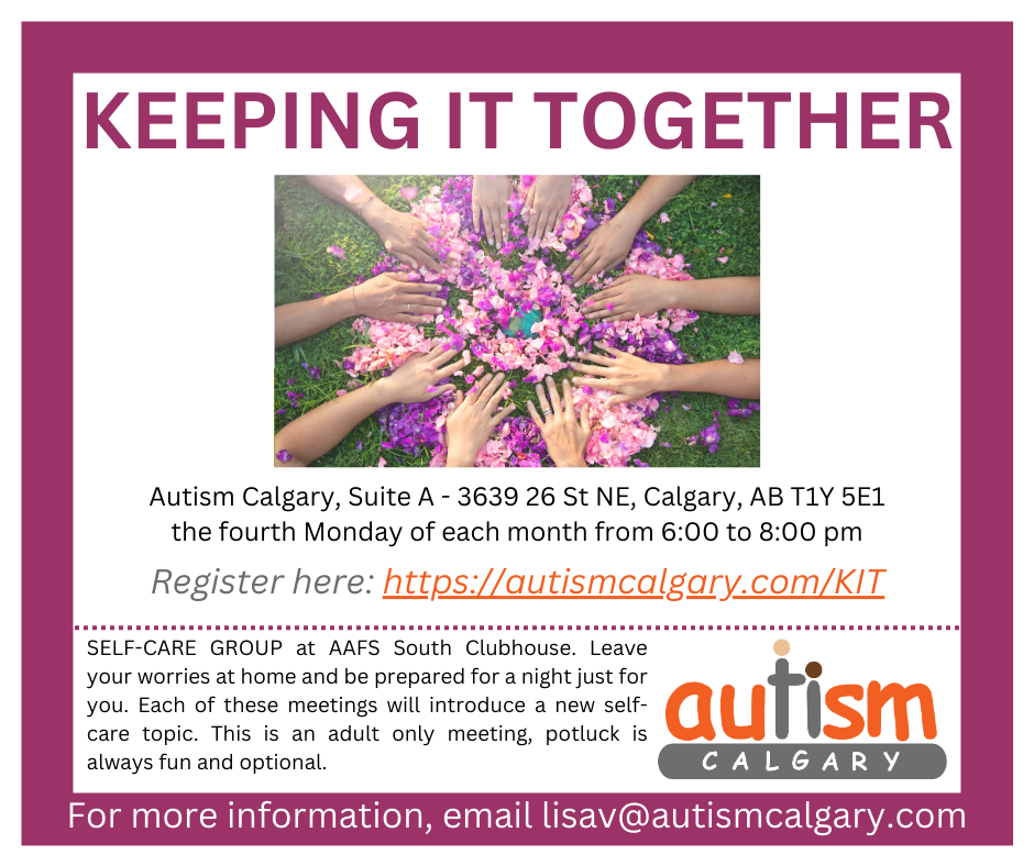 Keeping it Together (KIT) is a support group for autism mom’s that is hosted by Autism Calgary. There are a variety of topics & themes from physical activities to creative outlets & self care!
